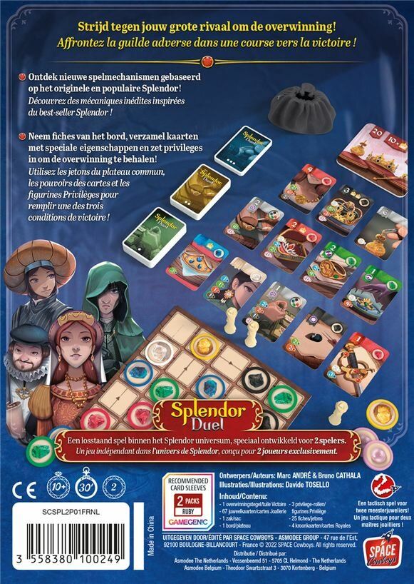 Splendor di Marc André è stato il primo gioco da tavolo pubblicato da SPACE Cowboys nel 2014. Nel corso di quell’anno ha vinto numerosi premi e ricevuto diverse nomination, ed è oggi uno dei giochi più venduti dello studio. Bruno Cathala (7 Wonders Duel, Mr. Jack, Kingdomino, solo per citarne alcuni) ha ideato Splendor Duel insieme a Marc André, mentre Davide Tosello ha realizzato le illustrazioni. Il gioco sarà disponibile a novembre 2022 nella gamma a 2 giocatori di SPACE Cowboys. Si tratta di un gioco da tavolo originale ambientato nell’universo di Splendor e offre regole, tattiche ed esperienza diverse dal suo predecessore.