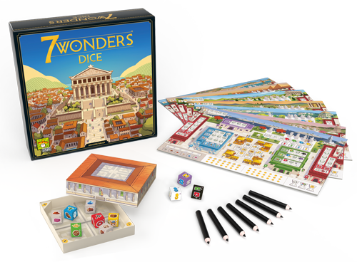 Una nuova versione di 7 Wonders, incentrata sulla meccanica Roll&Write. Si tirano i dadi e si sceglie quello che più conviene. Ogni simbolo è associato a un’area della plancia. Pagando il costo e spuntando le caselle, si otterranno gli effetti, come risorse, punti vittoria, monete e altro.