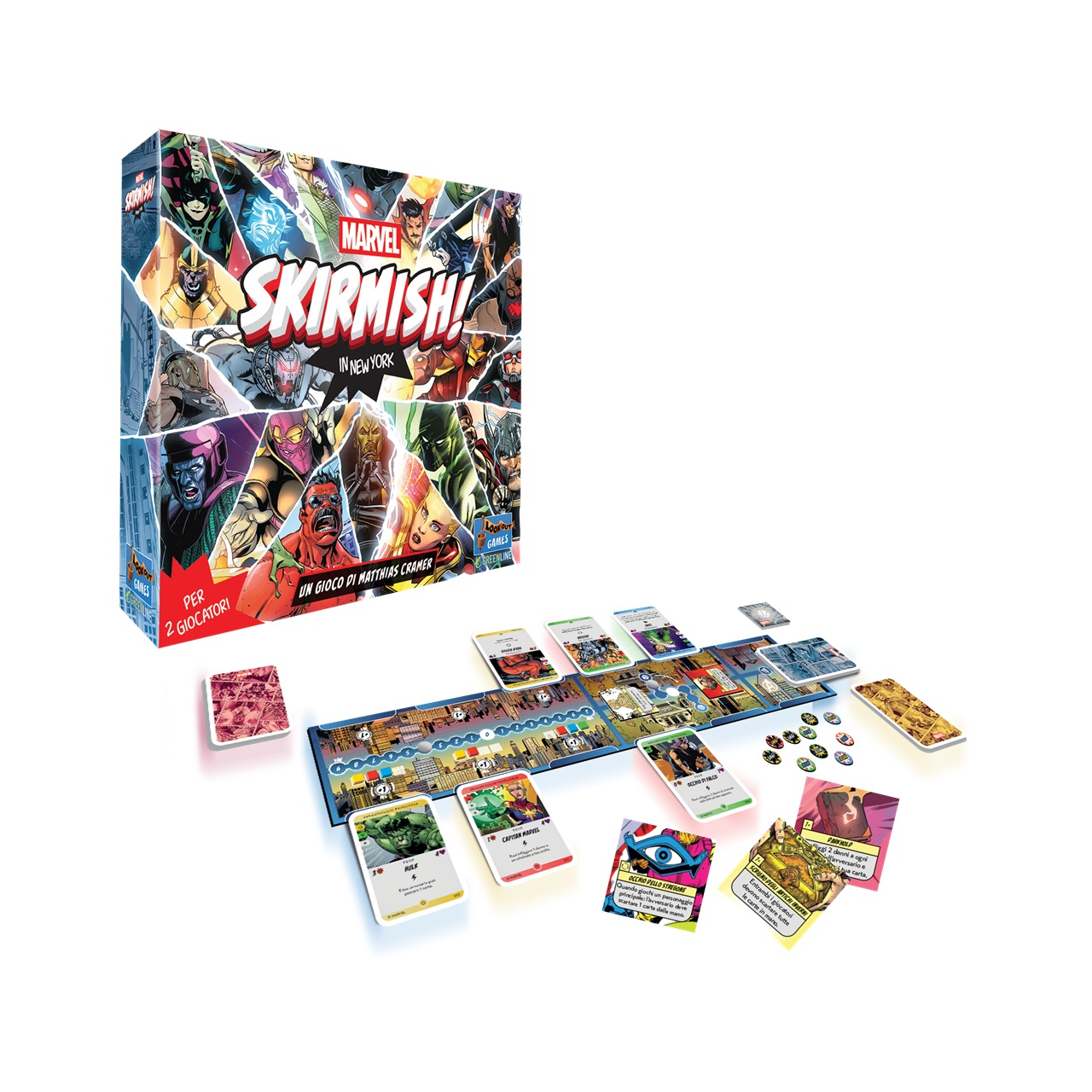 Un nuovo gioco di carte con licenza Marvel per due giocatori! Che ci si schieri con gli eroi o i criminali, l’unico obiettivo è reclamare il controllo della citta. Come? Giocando le proprie carte con attenzione, sfruttando i punti deboli delle carte avversarie, ottenendo potenti artefatti e strappando il controllo dei luoghi più importanti.