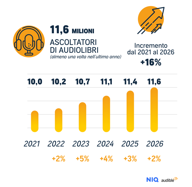 Cresce anche nel 2026, seppur lievemente, l’interesse per gli audiolibri in Italia: gli appassionati hanno raggiunto quota 11,6 milioni, con un incremento del 2% rispetto all’anno precedente. Un risultato che rafforza un trend ormai consolidato: negli ultimi cinque anni, infatti, il numero di ascoltatori è cresciuto complessivamente del 16%. È quanto emerge dall’ultima ricerca di NielsenIQ per Audible – società Amazon tra i maggiori player nella produzione e distribuzione di audio entertainment di qualità (audiolibri, podcast e serie audio) – che ogni anno monitora il gradimento del pubblico italiano le abitudini di ascolto e i nuovi trend sugli audiolibri in Italia.