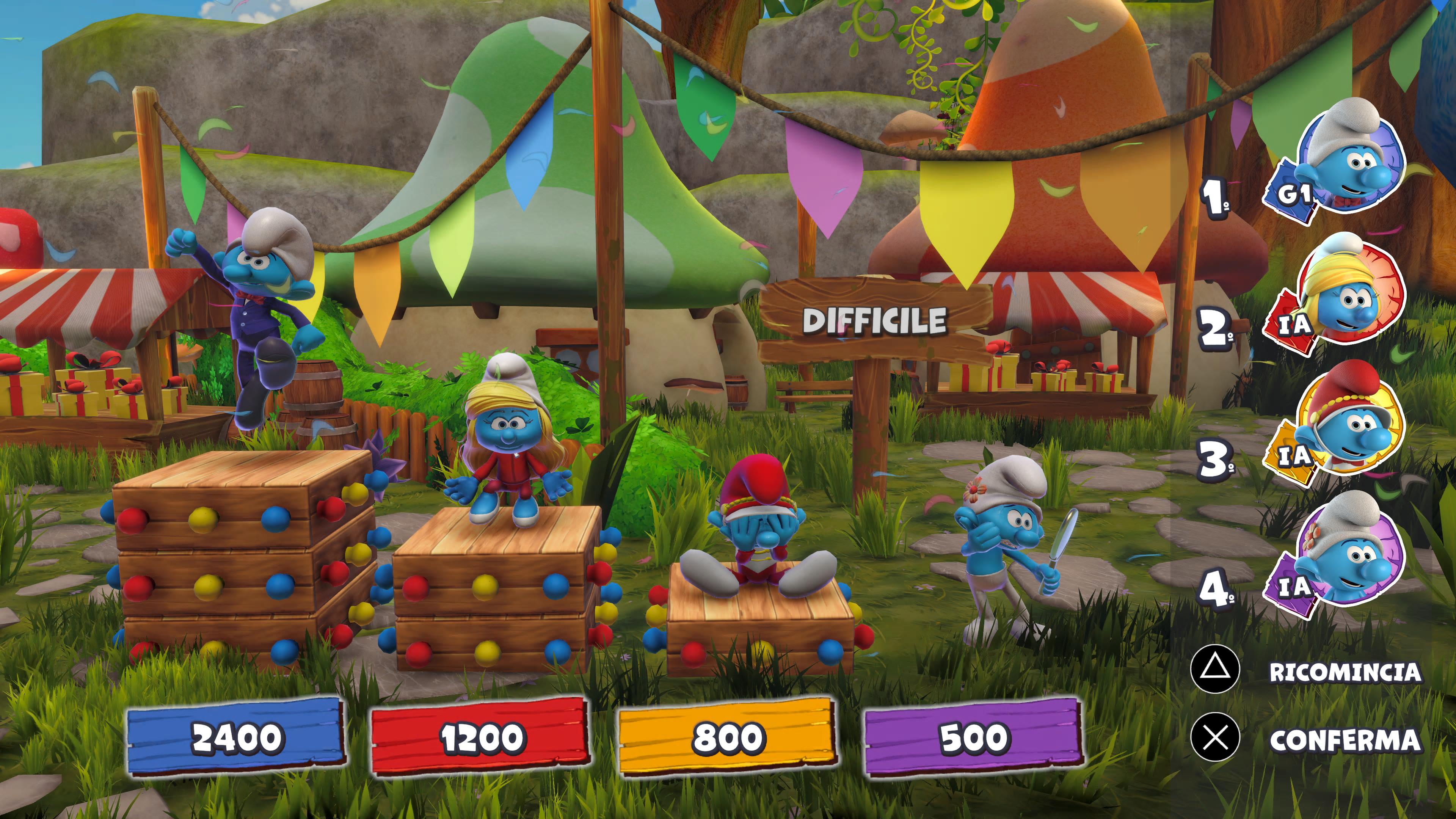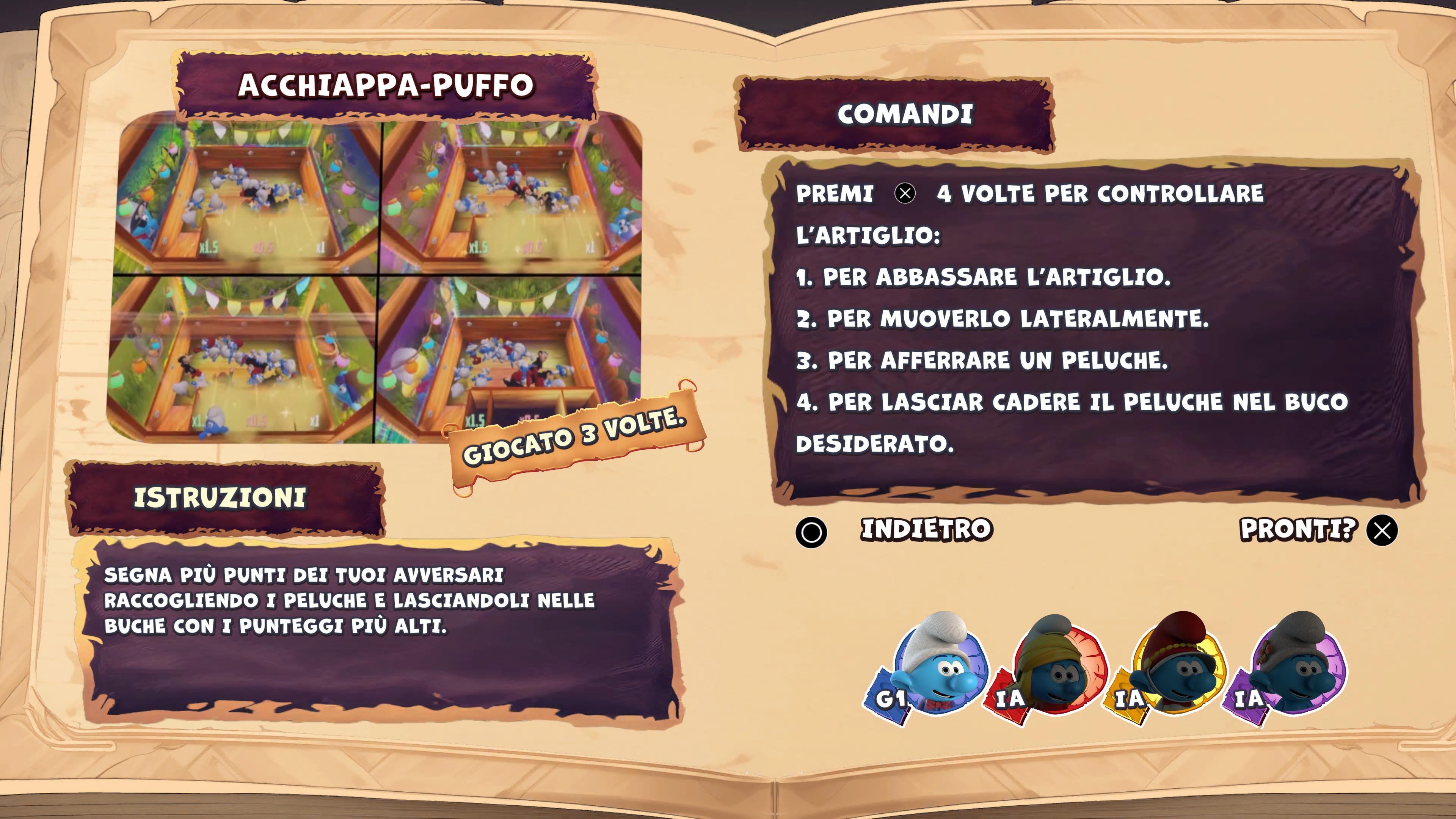 A differenza dei due titoli platform e quello dedicato ai kart, questa volta la software house transalpina ha proposto invece un party games, ovviamente dedicato e ispirato all’allegro mondo dei Puffi, in cui il giocatore potrà sia giocare diversi mini-giochi in compagnia o in solitaria, sia avventurarsi in una breve modalità storia. Composto quindi da 50 mini-games, che vanno dalle gare in bici, con autoscontri, diverse prove di riflessi, musicali, sfide sportive come basket, calcio e bowling, per citarne solo alcuni, nella modalità Sfida potremo affrontare ognuno di questi giochi scegliendo un puffo tra i 19 giocabili, affrontando o altri tre puffi utilizzati dall’IA o in locale con i nostri amici, scegliendo una delle tre difficoltà disponibili tra: Facile, Normale e Difficile.