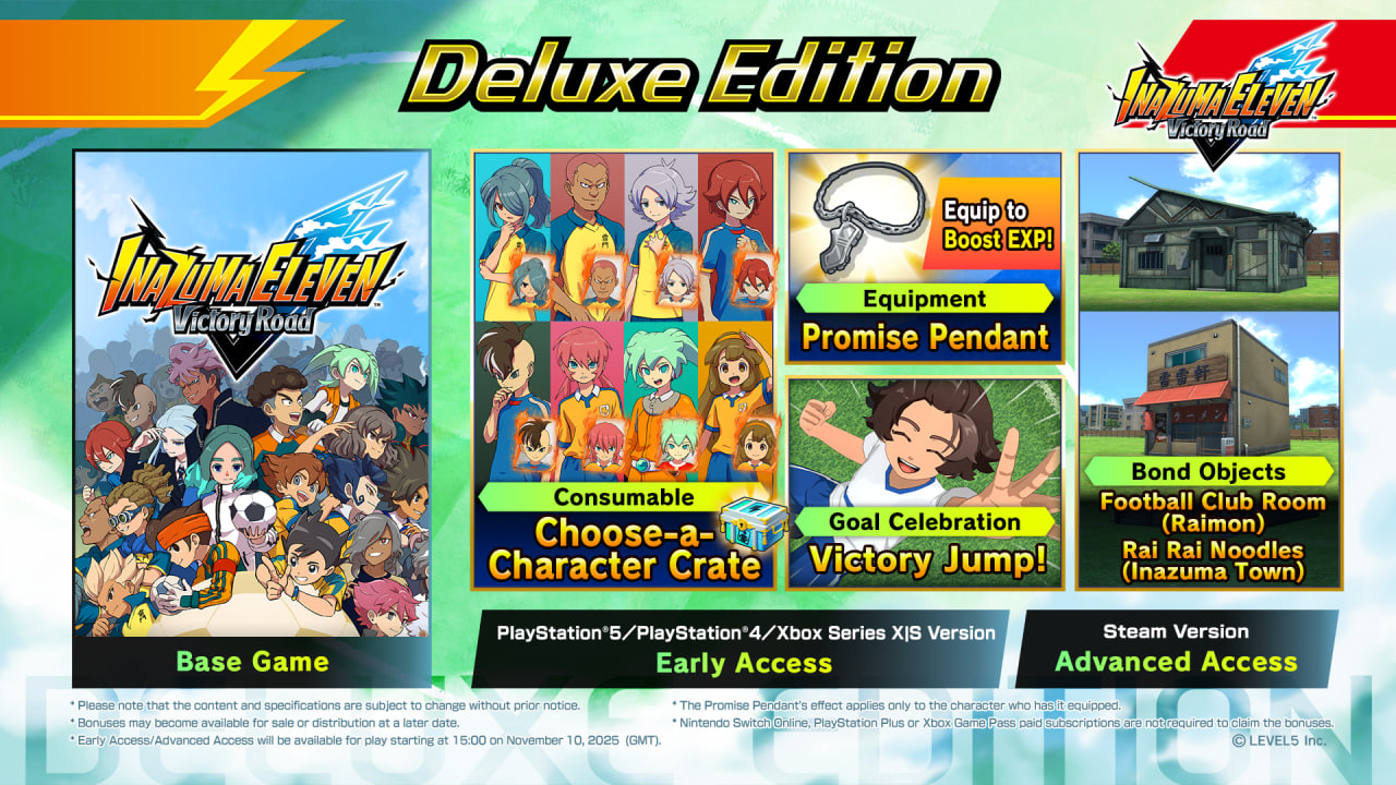 I giocatori che acquisteranno la Deluxe Edition potranno iniziare a giocare a INAZUMA ELEVEN: Victory Road in accesso anticipato su PlayStation 5, PlayStation 4, Xbox Series X|S e Steam.