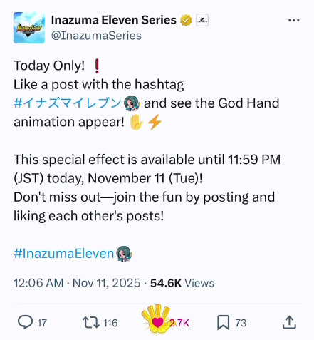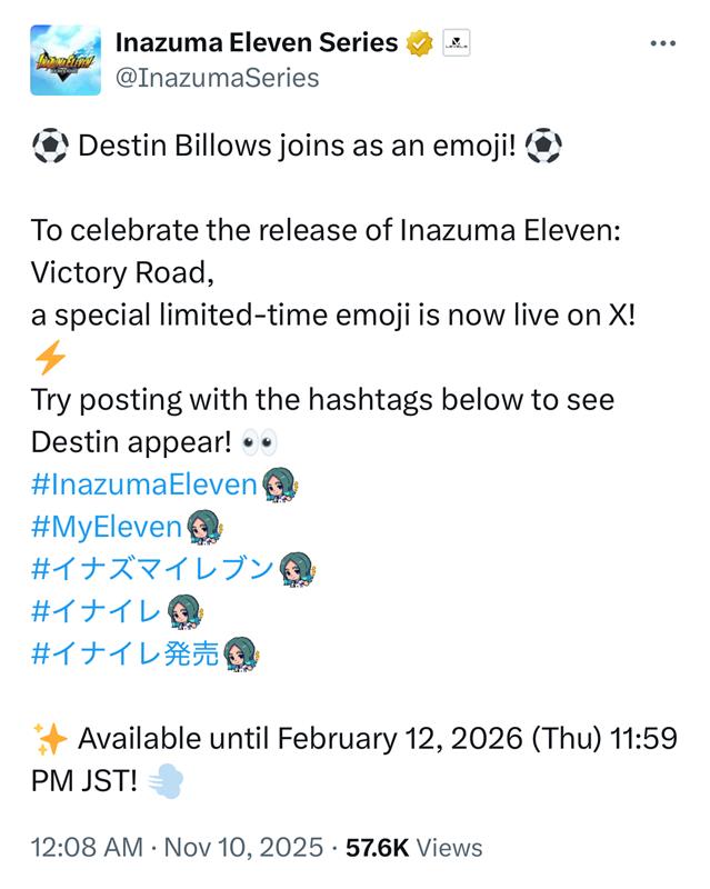 Per celebrare l’uscita di INAZUMA ELEVEN: Victory Road, su X (ex Twitter) saranno disponibili per un periodo limitato un’emoji speciale e una nuova animazione per il pulsante “Mi piace”, entrambe a tema Inazuma Eleven.