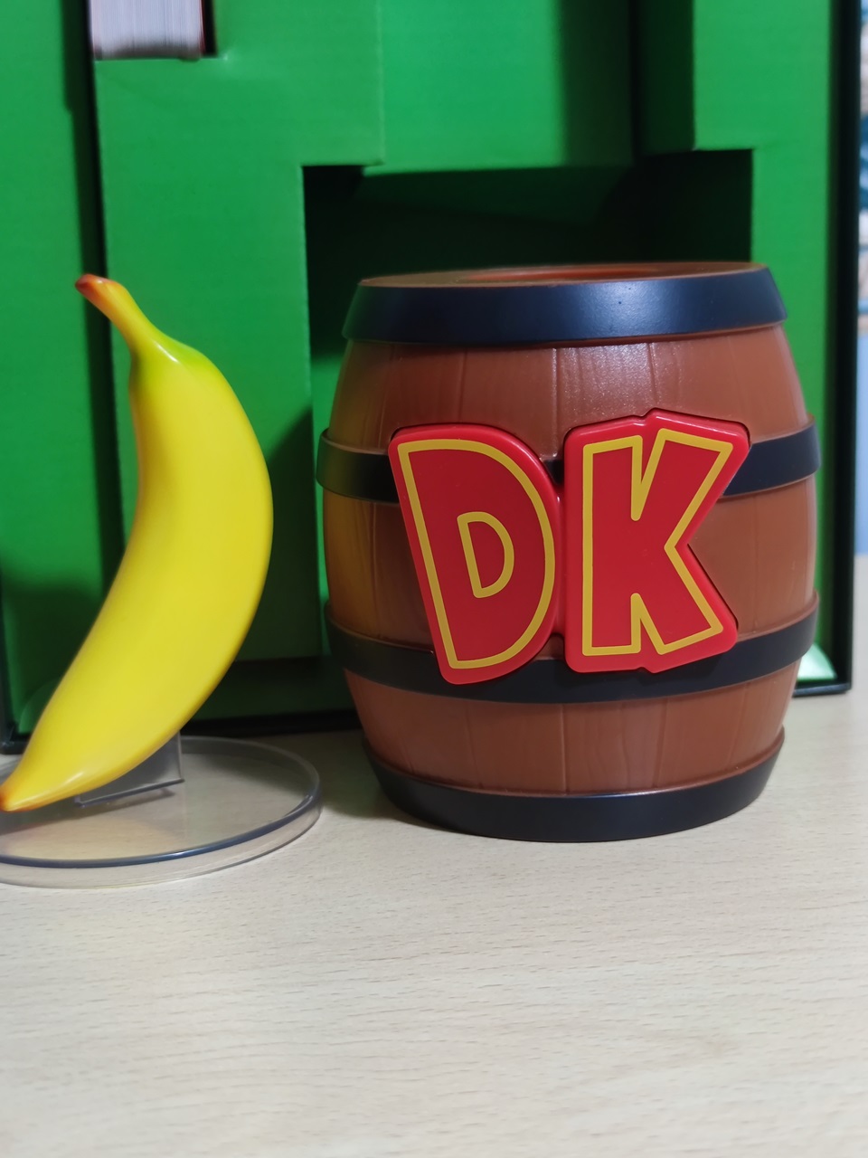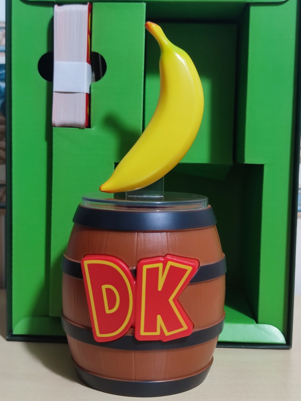 Ciò che colpisce fin da subito l’attenzione è proprio la scatola, di dimensioni tutt’altro che contenute, che presenta un intaglio trasparente per mostrare i componenti peculiari di questa edizione: un Barile DK tridimensionale e un totem a forma di banana. Entrambi sono realizzati in plastica e sono di dimensioni abbastanza generose così da dominare il centro del tavolo e rendere più funzionale e spettacolare ogni sfida di riflessi tra i giocatori. Il colpo d’occhio è immediato, molto forte ed entrambi i componenti rappresentano il punto focale dell’intero titolo.