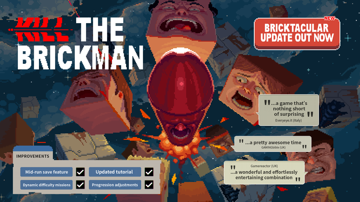 Kill the Brickman riceve un bricktaculare upadate. L’aggiornamento aggiunge importanti revisioni sulla base dei feedback dei giocatori: missioni con difficoltà dinamica, una funzione di salvataggio a metà partita e un tutorial completamente rinnovato!