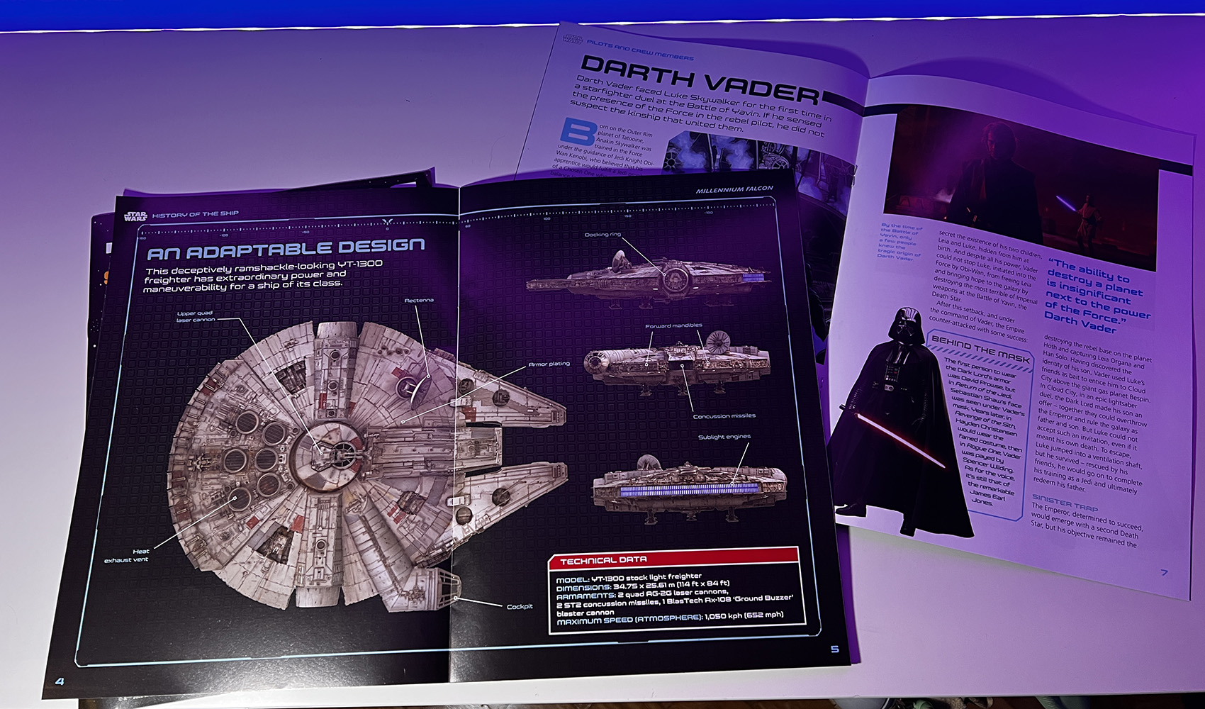 Ogni uscita è accompagnata da un fascicolo esclusivo in lingua inglese contenente non solo curiosità e dettagli sulla nave e sui suoi piloti ma anche la storia della saga di Star Wars dai film alle serie animate tra cui Star Wars The Clone Wars e Star Wars Rebels. Il primo numero dedicato ovviamente al Millennium Falcon sarà venduto al prezzo di lancio di 4,99€ invece che 9,99€ ma abbonandosi si riceveranno tantissimi regali aggiuntivi.