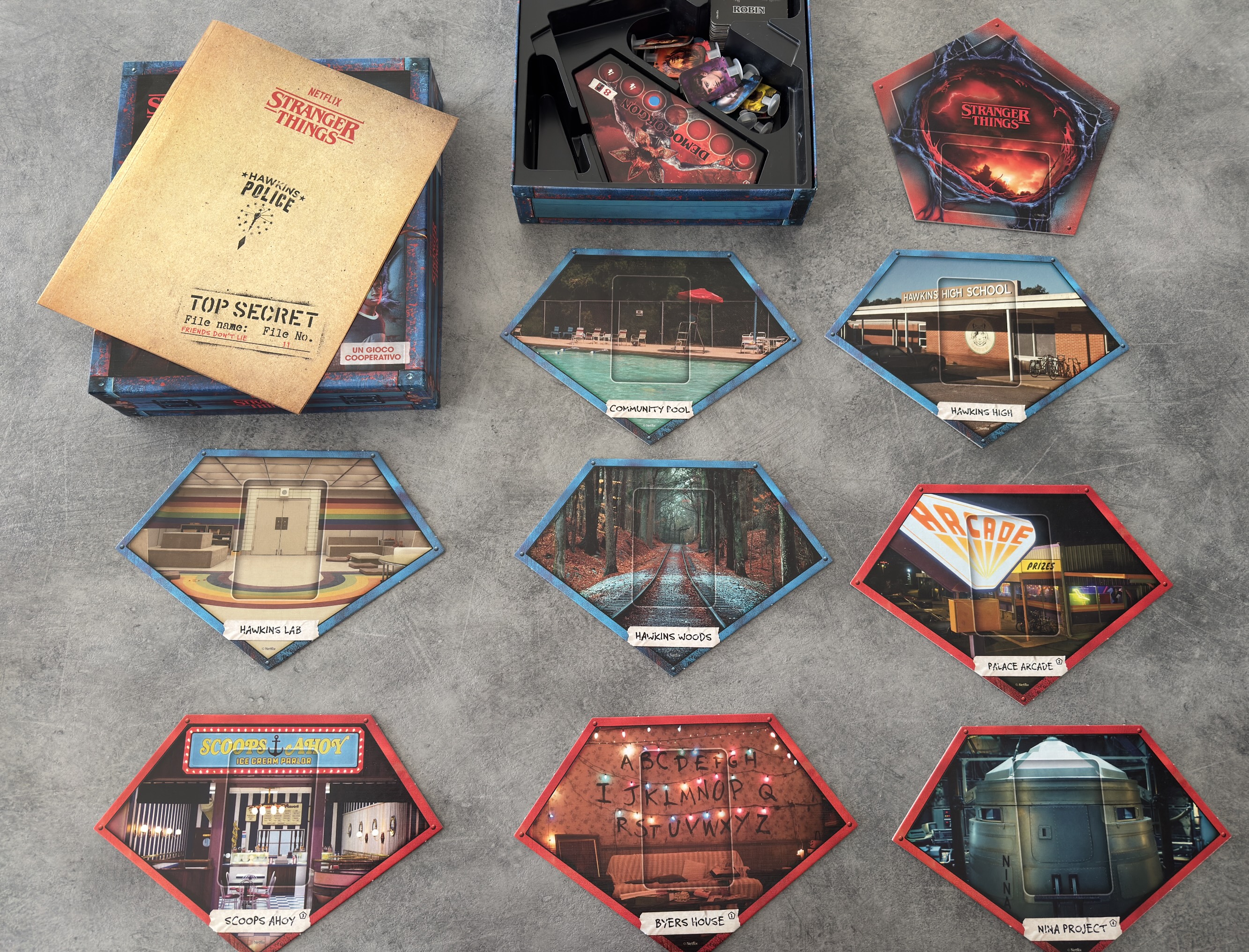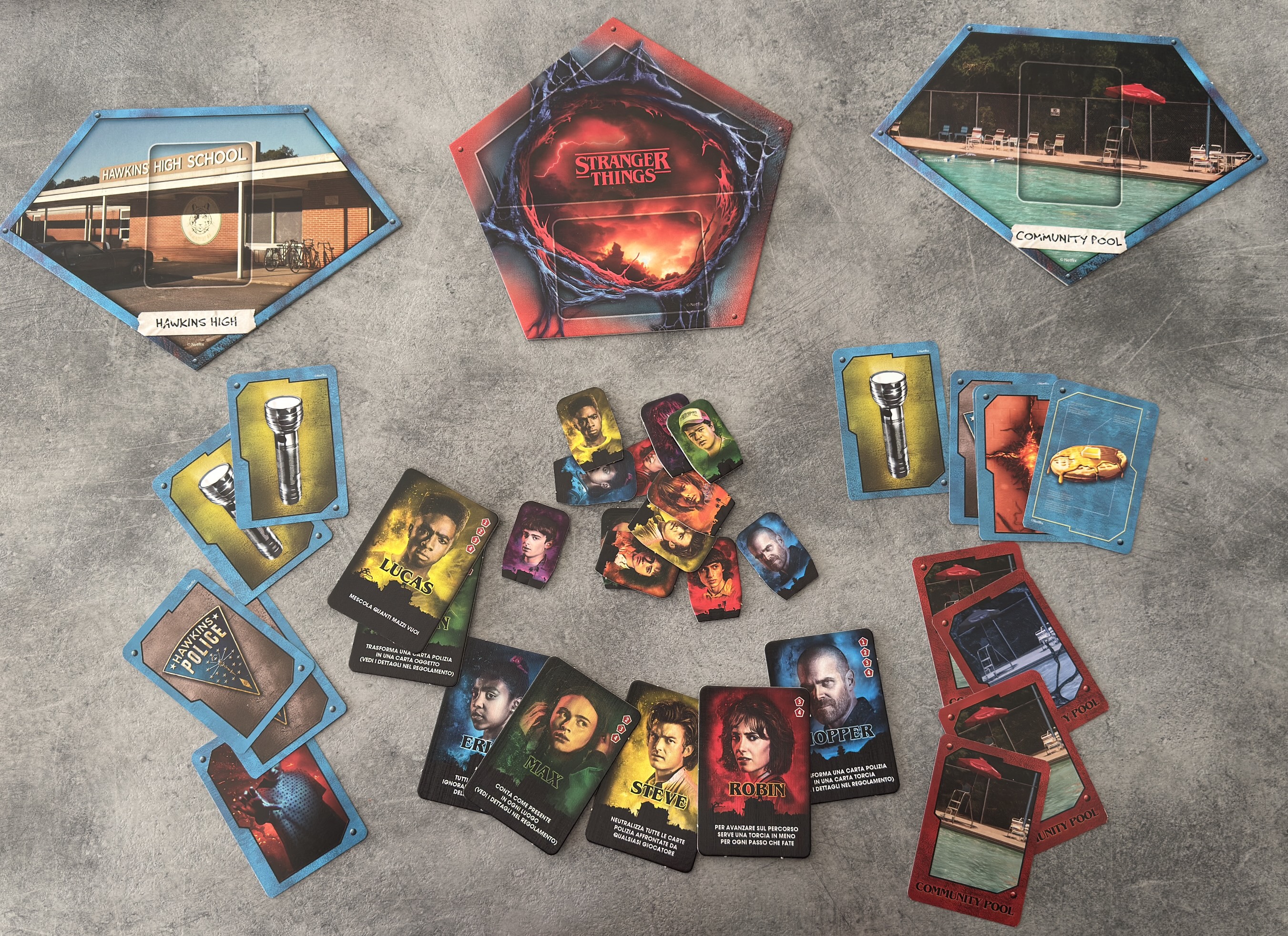 Se Stranger Things è riuscito a ottenere il successo che ha ora è senza dubbio anche grazie al suo comparto artistico. Al sapiente mix di atmosfere anni Ottanta, di luci al neon e di quel design sulla falsa riga di Dungeons & Dragons che ha reso iconici i vari mostri. Ebbene, grazie al lavoro di Maurizio Santangelo, l’aspetto grafico di Friends Don’t Lie riesce a mantenere intatto il fascino del materiale originale. Questo è reso possibile dalle splendide illustrazioni delle varie carte e dalla grafica “home-made” che emerge da ogni pezzo della plancia. Plancia nella quale i nomi dei vari ambienti, per esempio, sono scritti su quello che sembra essere del nastro adesivo di carta. Meno interessante il lavoro svolto sulle carte oggetto, che però hanno lo scopo di risultare immediatamente riconoscibili. Una necessità che ha spinto il grafico a lavorare di sottrazione, permettendo così una buona fluidità del gameplay.